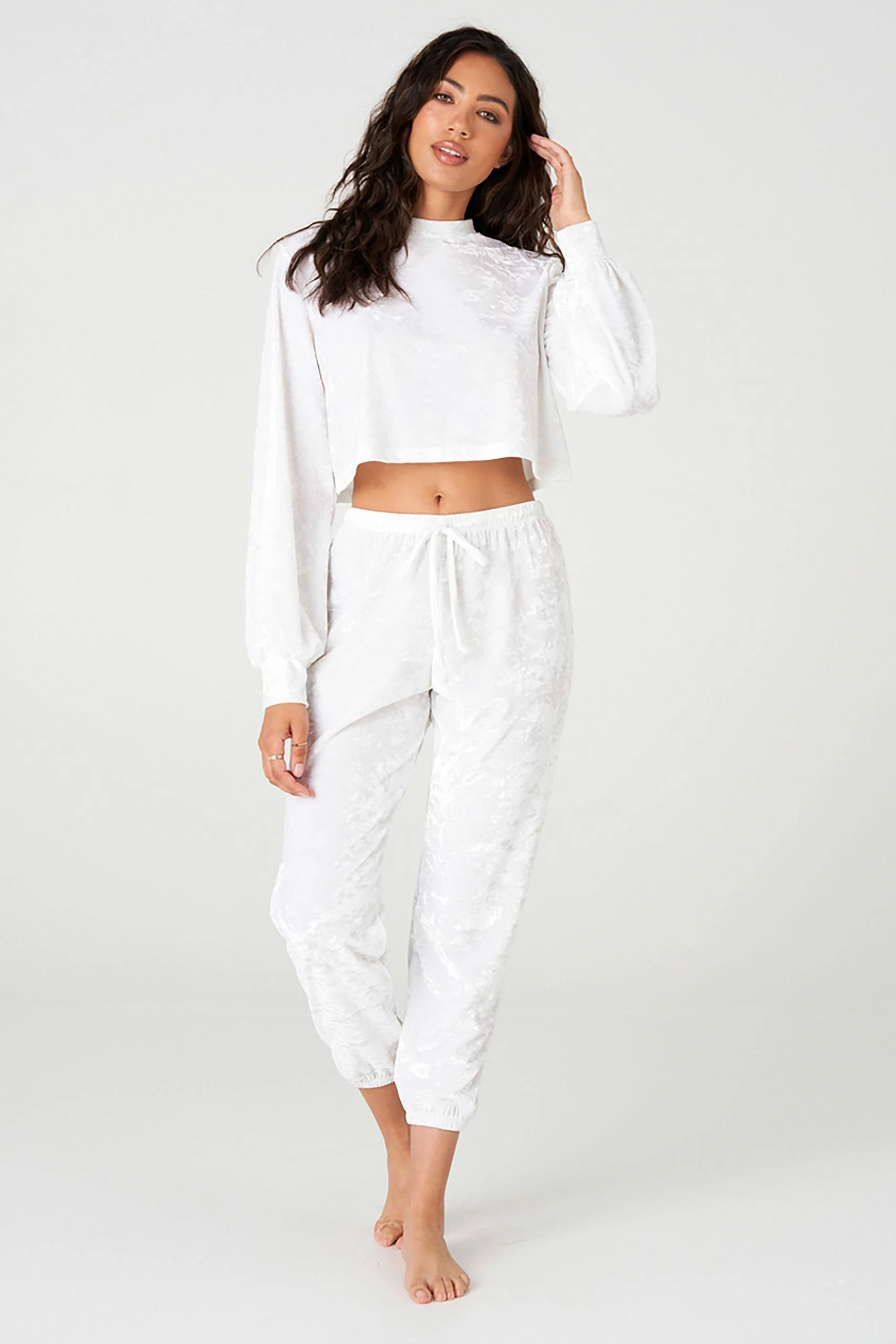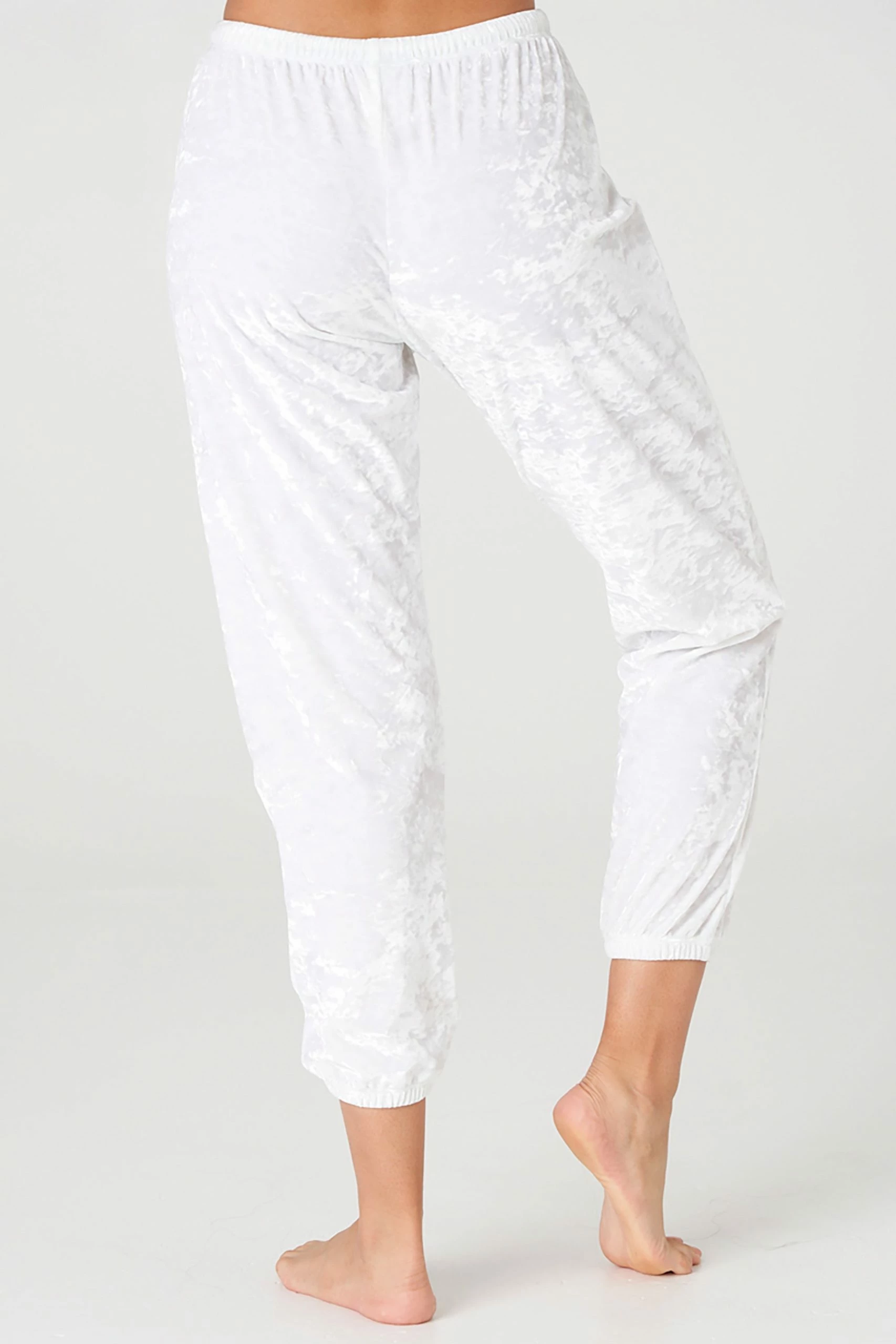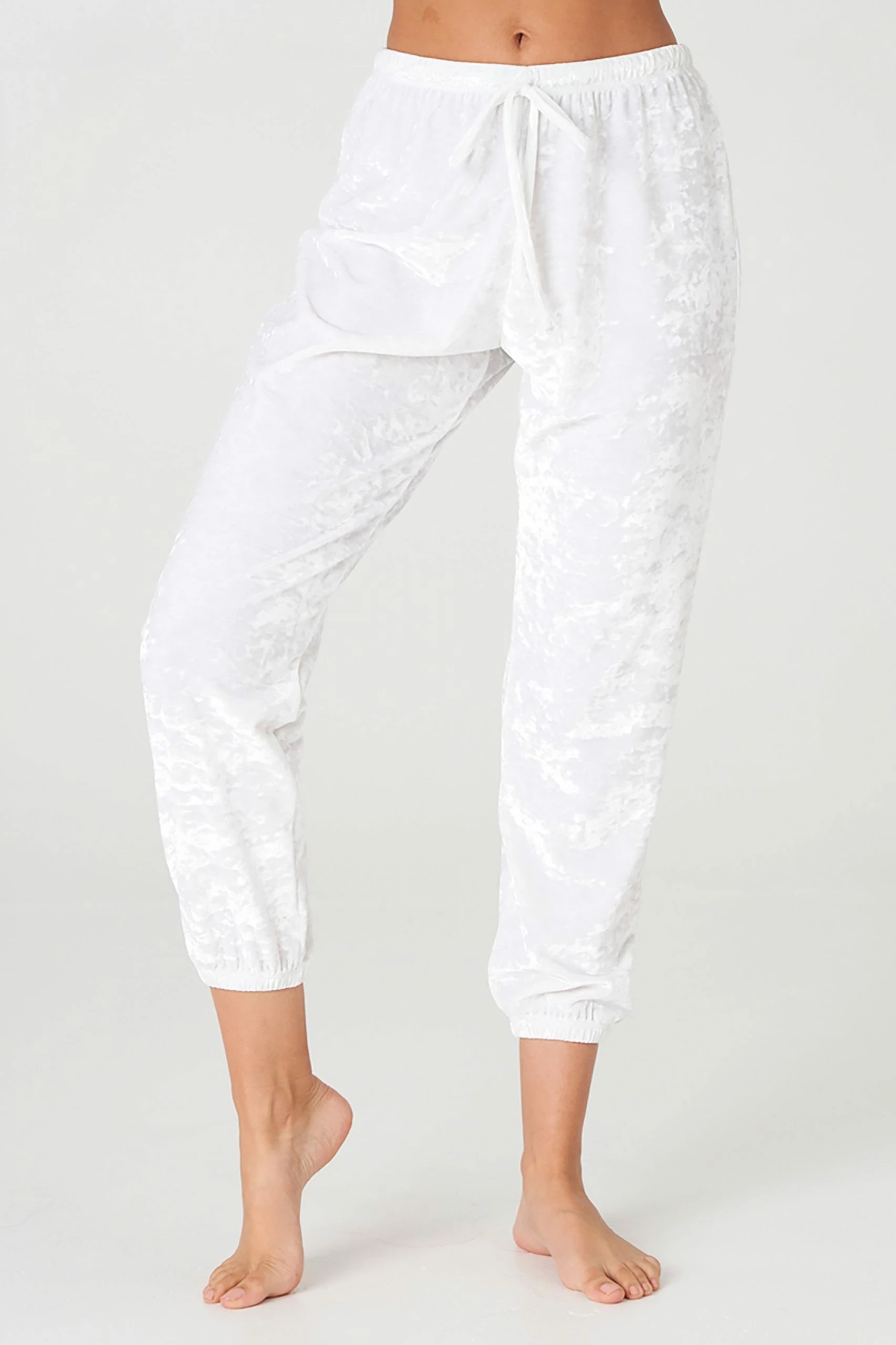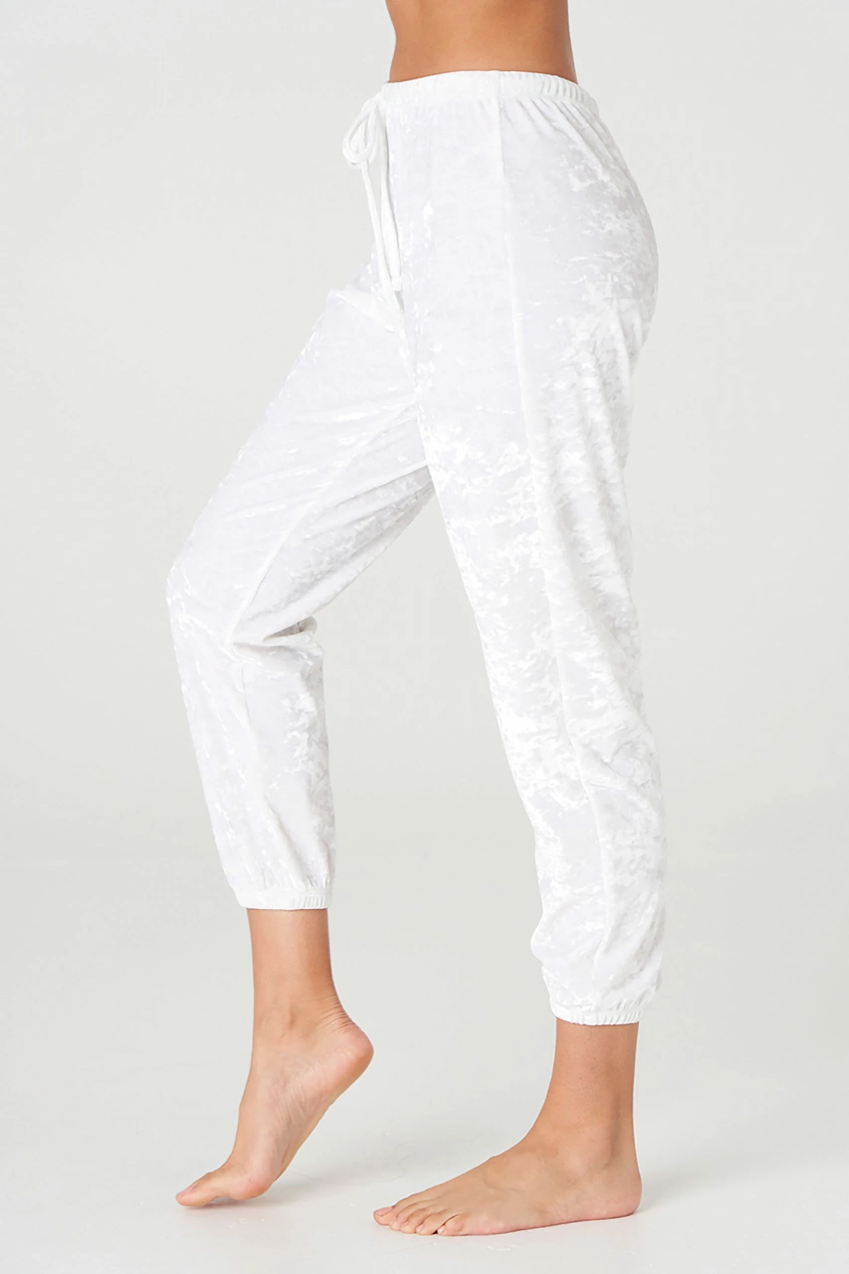 Indulge this season with our new and luxe Velvet Sweatpant featuring a cozy crushed velvet fabrication. This style features an elastic drawstring waistband for easy pull-over style and elastic tapered leg. The perfect style for elevated lounging. Complete the look with the Velvet Crop – Opal Crushed Velvet for an extra stylish matching set.