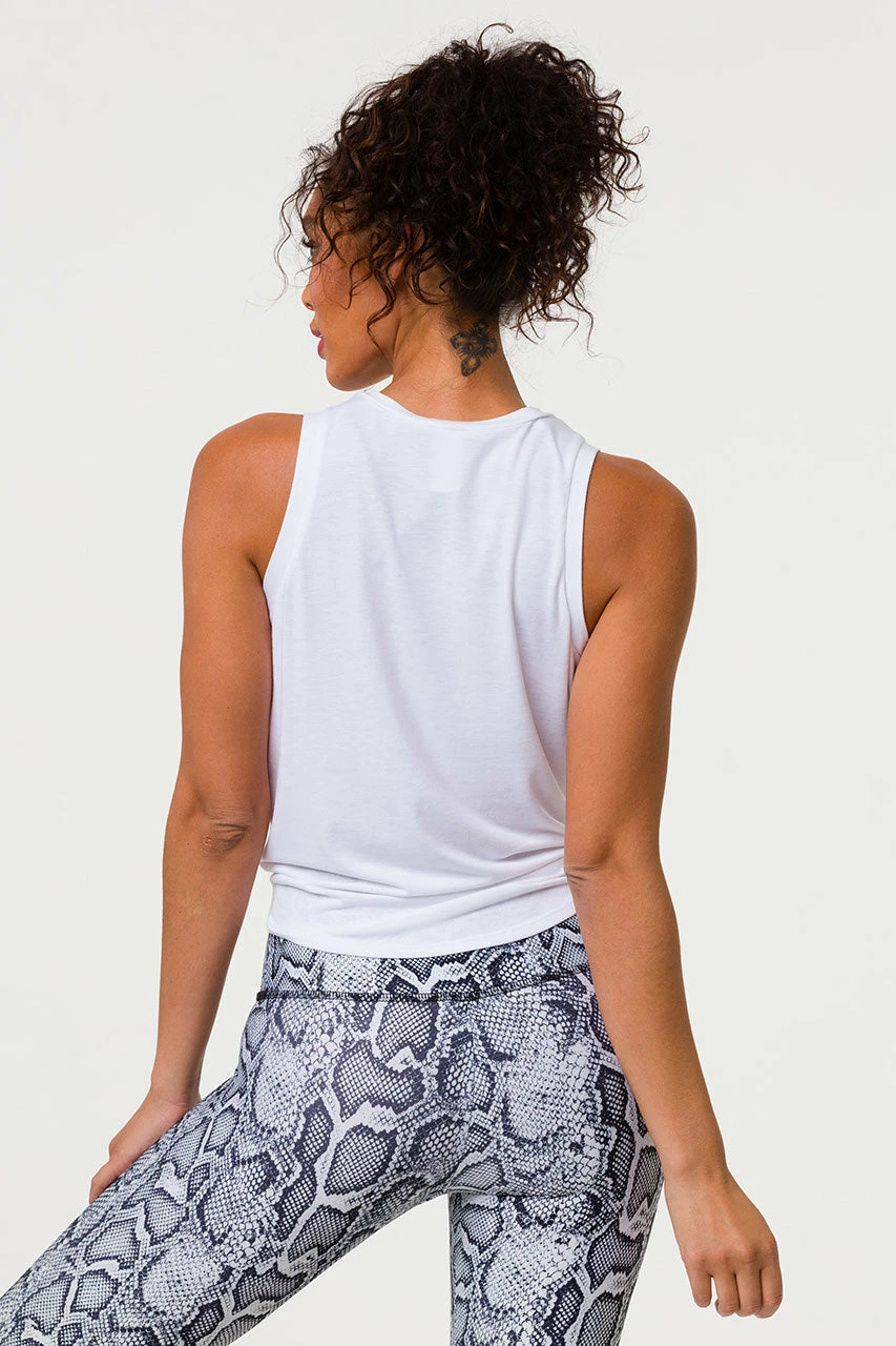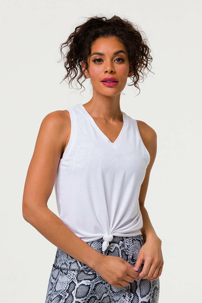 The Knot Tee is a classic v-neck tank that will take you from studio to street. Wear tied for a cropped look or long for more coverage. Made from a jersey spandex blend that is super soft and comfy!
