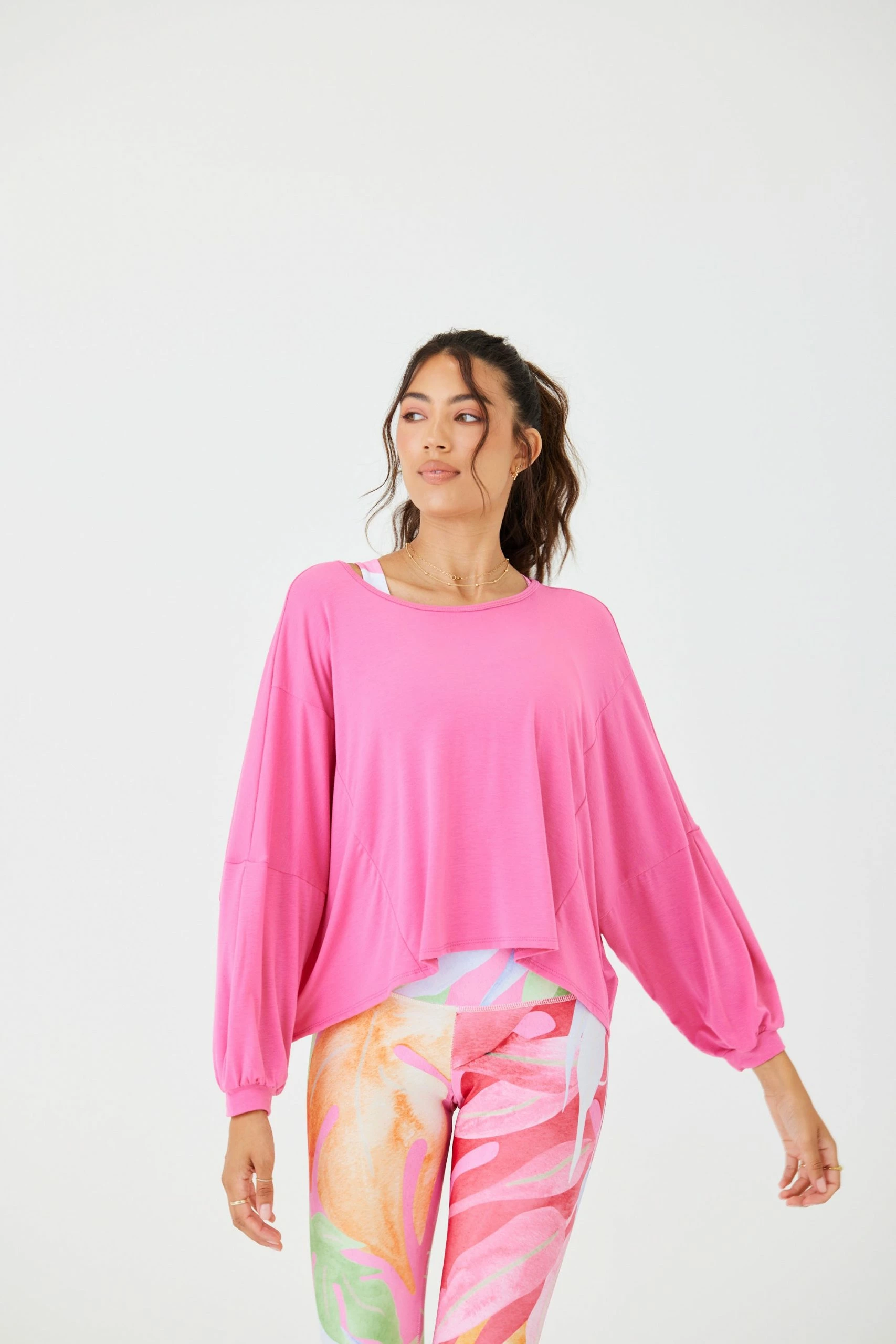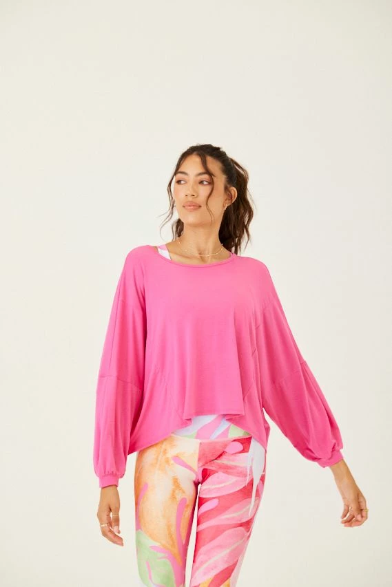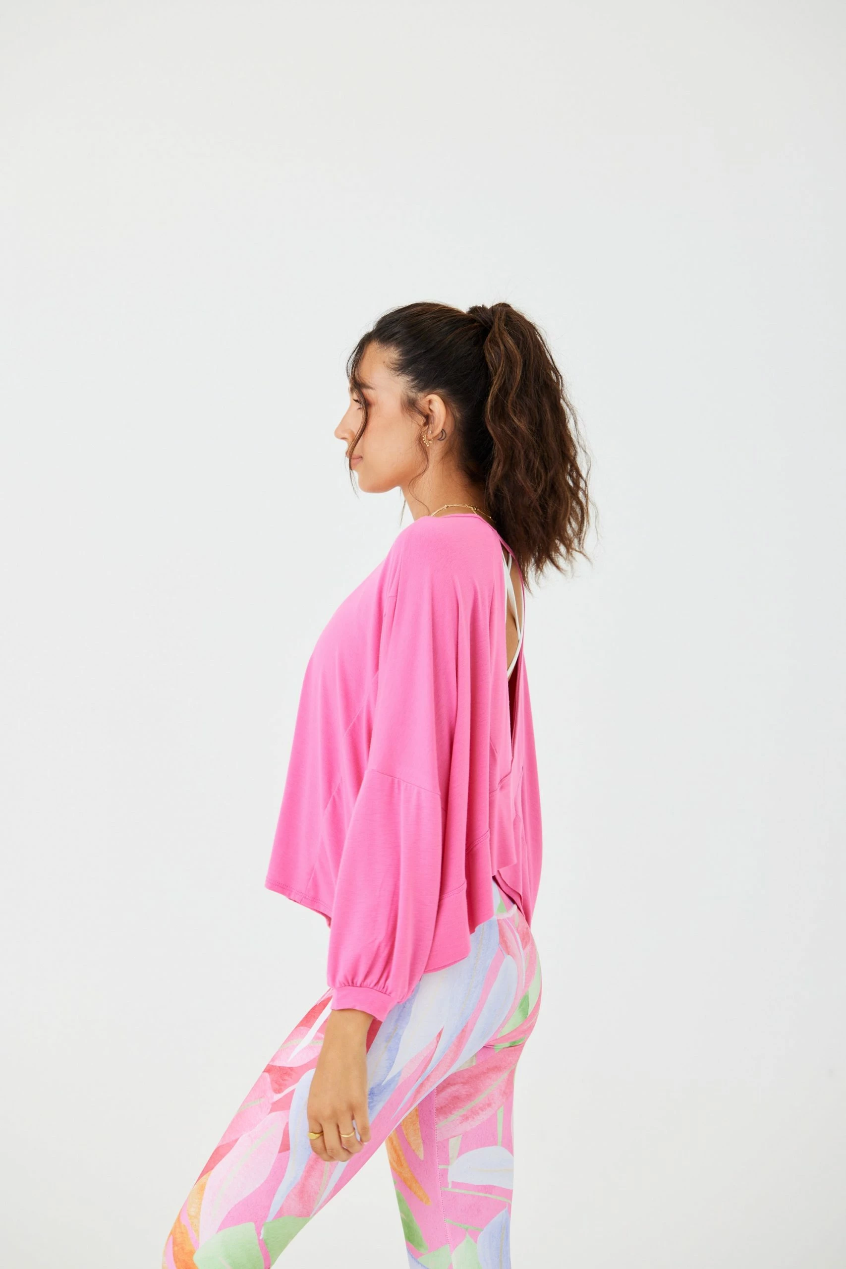 Raise vibrations in the OM Top. Top off your effortless look with this flowy silhouette, gorgeous cut-out back, and feminine puffed sleeves. Made from a jersey spandex blend that is super soft and comfy.