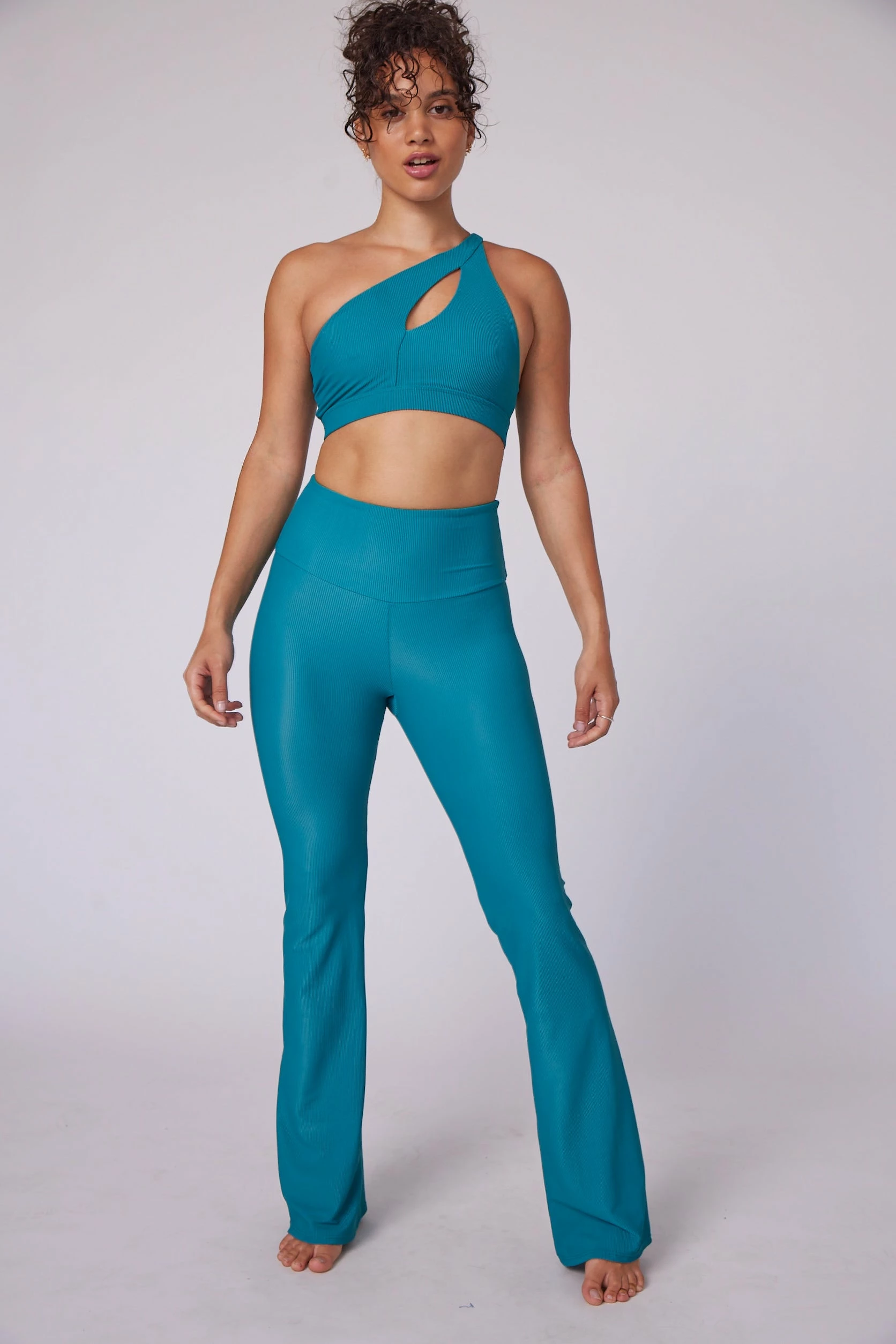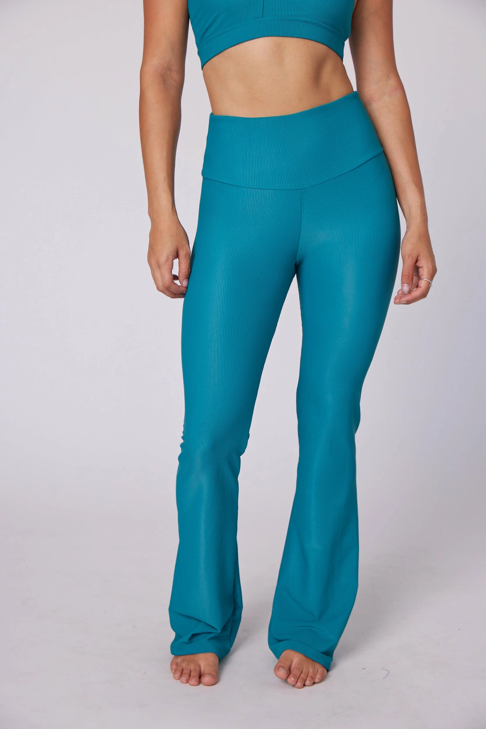 She’s got flare. Made from our textured ribbed fabric, the high waistband and fit-to-flare silhouette will accentuate all the right places. Designed to be snug around the hip, waist, and thighs then create a subtle flared lower leg. Get a kick out of this new style.