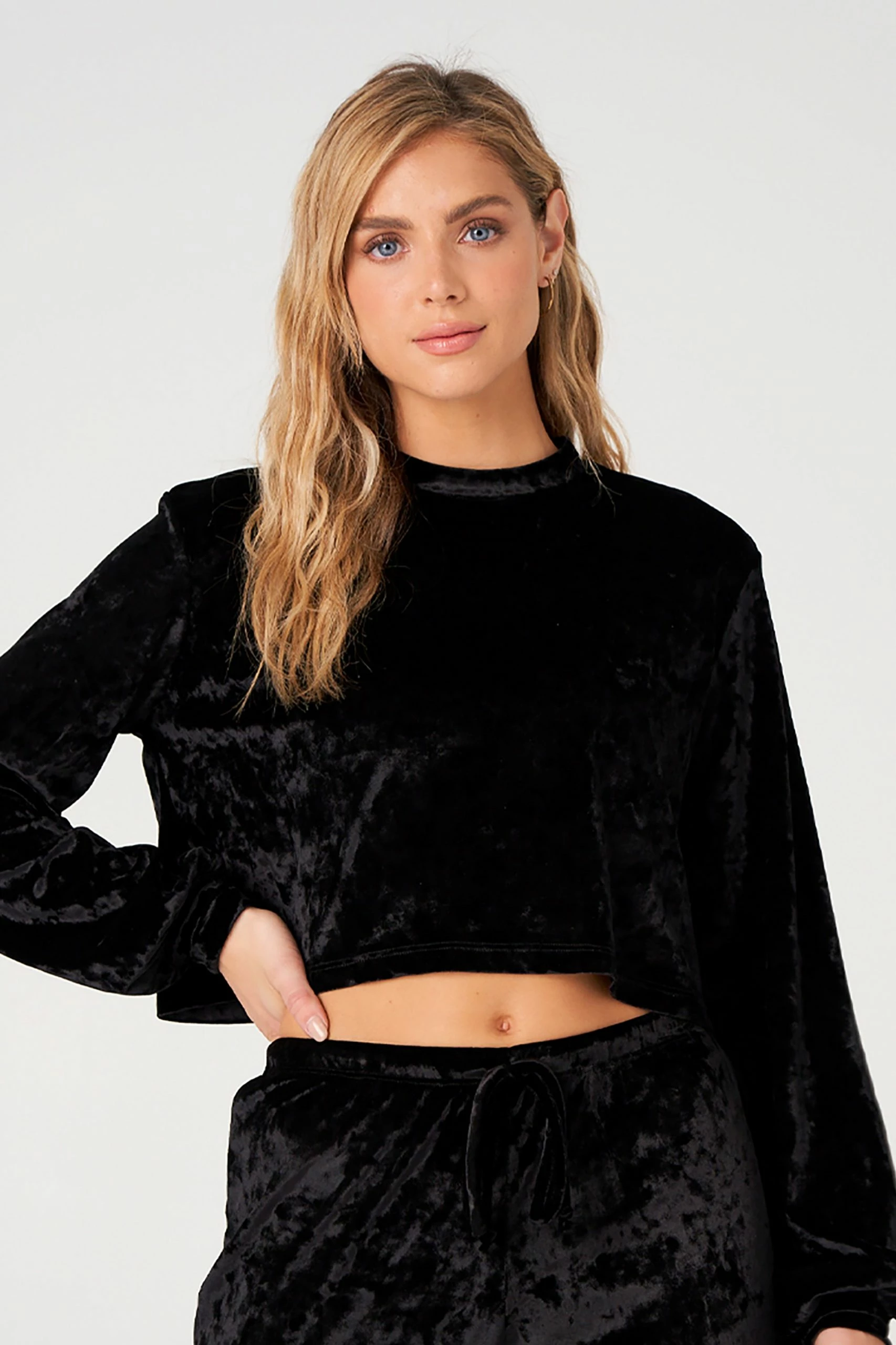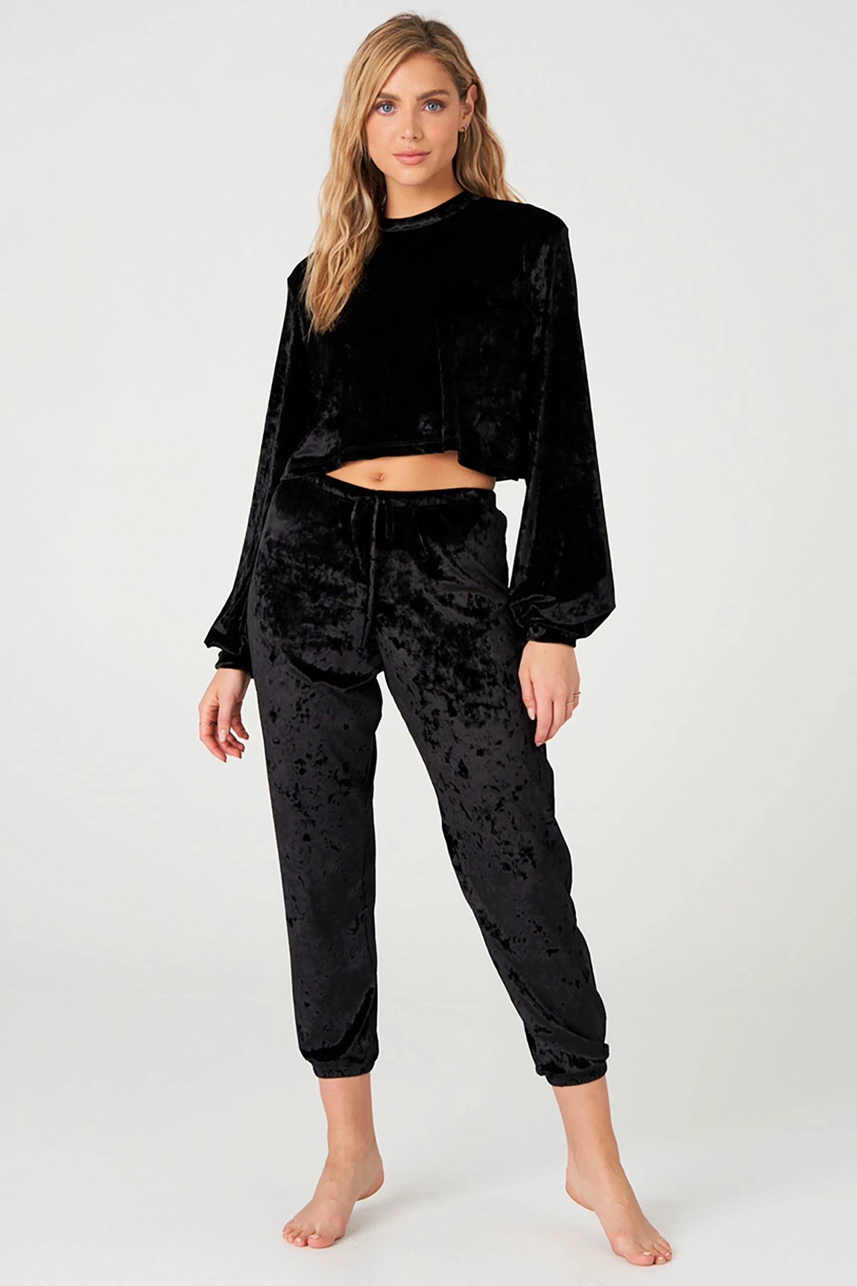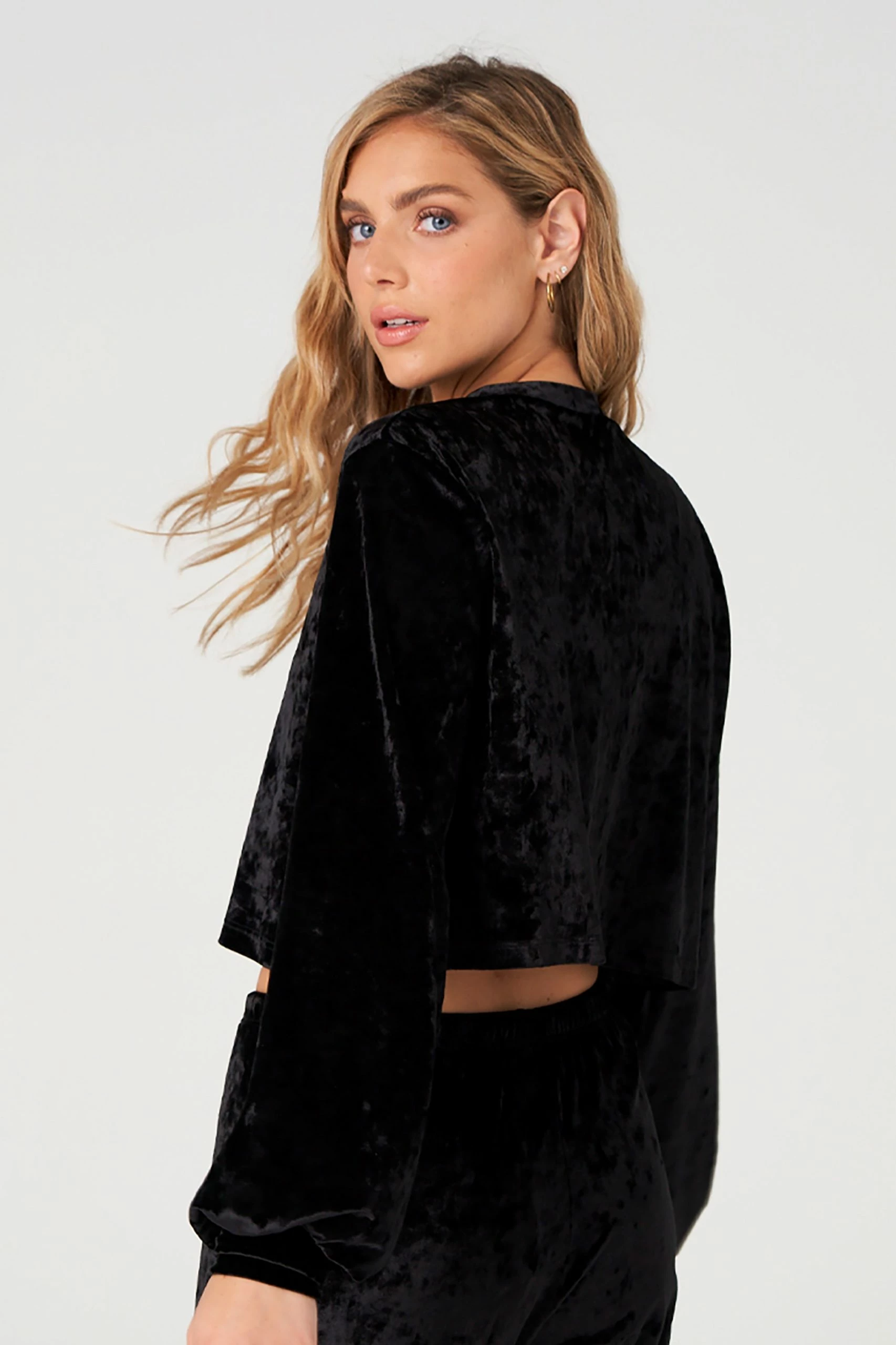 We’ve got a crush. The Velvet Crop is a long sleeve, crewneck crop top featuring billowy blouse-like sleeves in a crushed velvet fabrication. Complete the look with the Velvet Sweatpant – Opal Crushed Velvet for an extra cozy and stylish matching set.