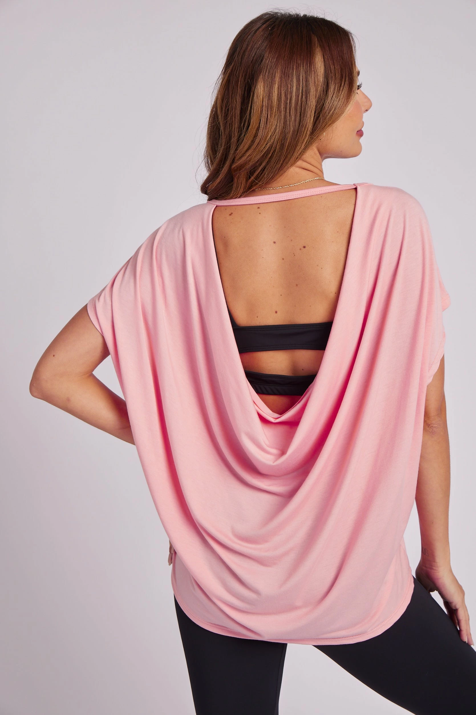 The Drop Back Top is a softly draped short sleeve flowy top with a high neckline and gorgeous cut-out back. Made from a jersey spandex blend that is super soft and comfy.